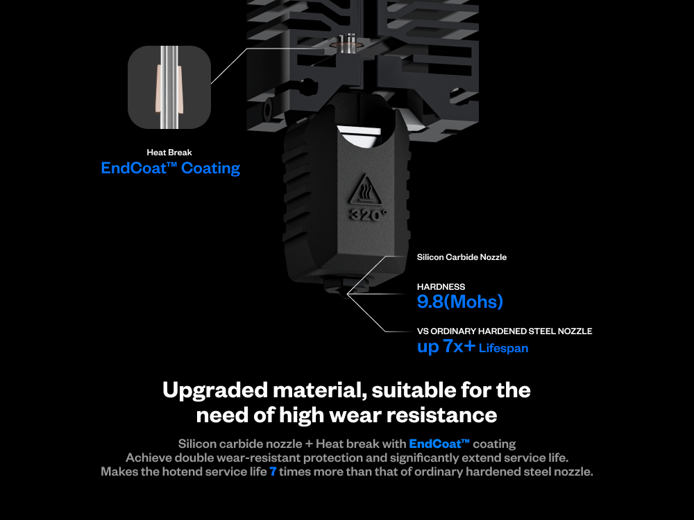 The addition of a silicon carbide nozzle and heat break with EndCoat™ coating provides double wear-resistant protection and significantly extends the service life of the hotend up to 7 times that of ordinary hardened steel nozzles.